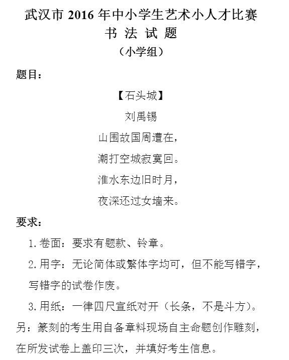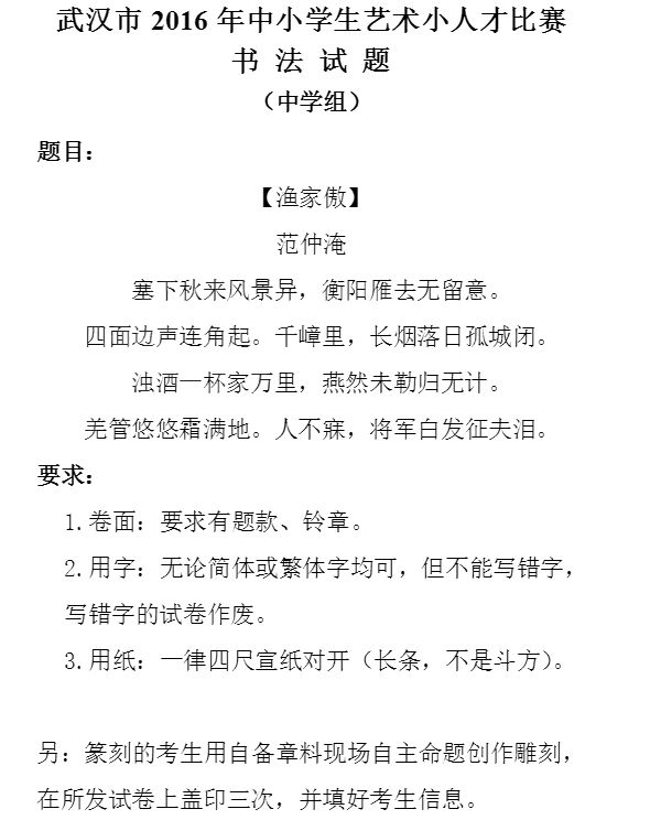 每年11月左右武汉市各区级艺术小人才比赛开始报名,获奖者将有资格进入2019年市级艺术小人才比赛。由于市级艺术小人才比赛名额有限制,按各区在校人数来分配,所以各区分配到的名额不同,有的区获区级一等奖可参加市级比赛,而有的区则不行。很多区都是从一等奖获奖选手里推荐评分排名靠前的考生。艺术小人才分音乐类和美术类两个大类,音乐类包括声乐、舞蹈、器乐、综艺,美术类包括绘画、陶艺、书法,每年3月中下旬举行市级艺术小人才比赛。