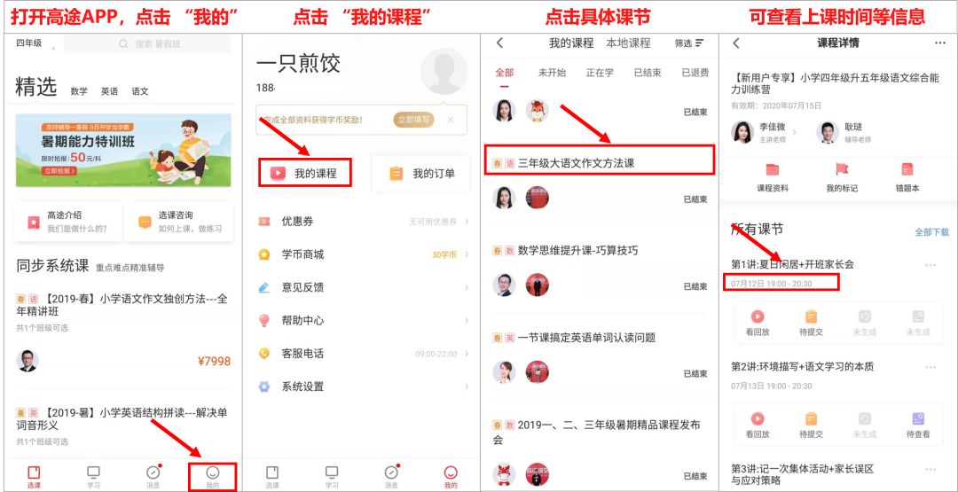 可以手机/iPad下载【高途课堂】APP:【我的】→【我的课程】查看各科课表和上课时间。课程支持1年内,无限次回放。