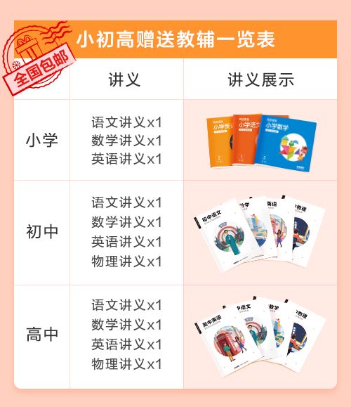 36元=数学+英语+语文+物理=16节名师直播课+4位一对一辅导老师+4本金牌教辅+VIP专属学习群!