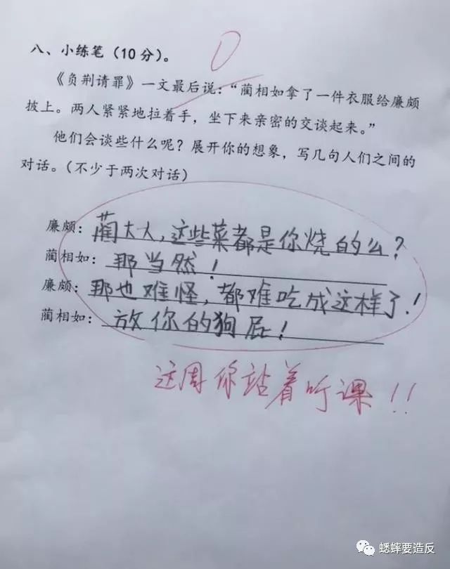 小学的课文《负荆请罪》描写的蔺相如与廉颇之间的对话,展开同学们的想象力。把他们之间会说的话写出来。而这位同学不走寻常路,“以询问蔺相如是否烧了这些菜,还说菜都难吃成这样了。”老师批阅试卷的时候前面的同学都是按照规定答题,唯独这位同学例外,这可把老师惹生气了。直接写评语,让这位学生这周都站着上课。