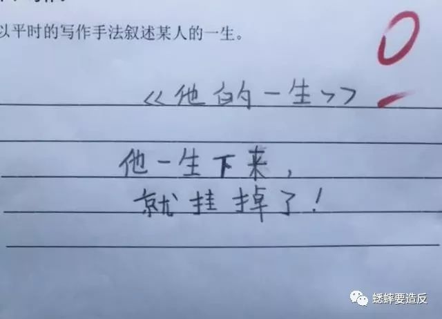 这个试卷也是关于写作文的,题目要求是以平时的手法叙述一个人的一生。这位熊孩子为了节约自己写作文的字数,直接用“他一生下来就挂掉了”结束了一个人的一生。老师也同样是给出了0分。那么这位同学的语文成绩肯定又是不及格了。