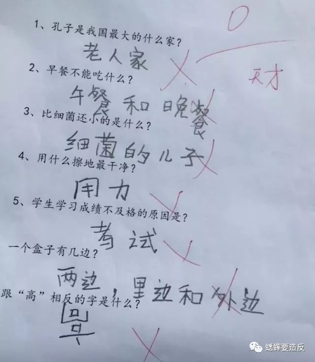 这个同学的答案就连老师也写下评语是天才,每个答案都堪称是段子手,“孔子是我国最大的什么家”——老人家,用什么擦地最干净——用力。乍一看这些答案似乎也没有什么不对的地方。你小学时候犯过这样的错误吗?