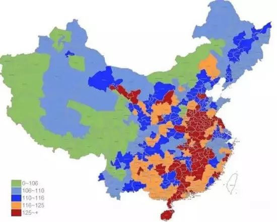 下图为最近一次人口普查数据图:2010年0-9岁人口男女性别比,红色表示男女比例超过125:100,看看你属于哪个区域?