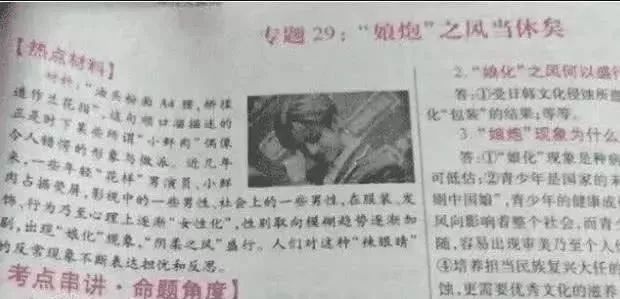 在某教科书上写着“娘炮”,讲述“娘炮”之风当休矣,并且还配上了蔡徐坤的图片,不得不说这真的是赤裸裸的侮辱了!