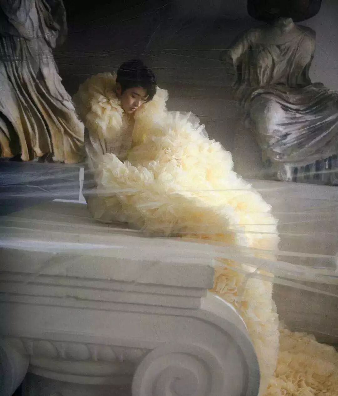 直到他开始在时尚大片里,玩那些怪里怪气的造型,一扇新世界的大门被打开了。一道谜题是,为什么中规中矩的东西放蔡徐坤身上就是中规中矩,但普遍很难驾驭的、大胆前卫的、浮夸扯眼球的奇装异服,被蔡徐坤穿出来,嘿,还挺能hold得住?