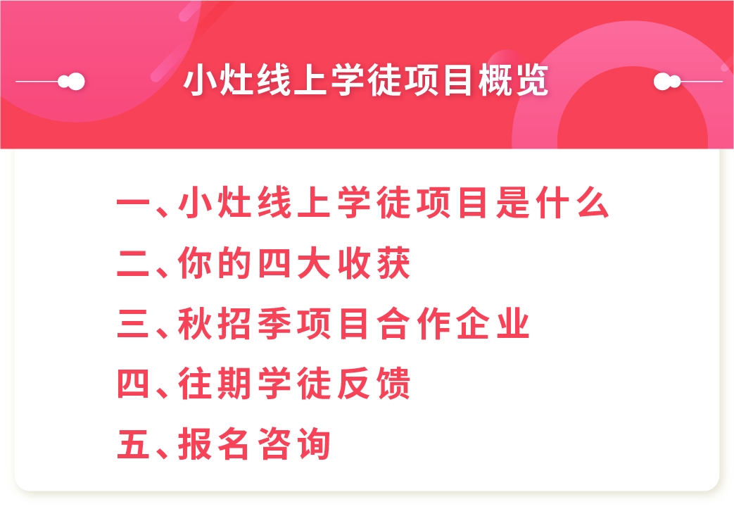 小灶线上学徒项目是针对在校大学生,缺乏高质量项目/实习经历,以及岗位必备关键技能,联合知名企业以及各行业资深导师,打造的以企业真实项目为基础,以提升岗位能力为目的的企业实战项目。这是一个重实战、重输出、重软硬能力打造的职业赋能项目。