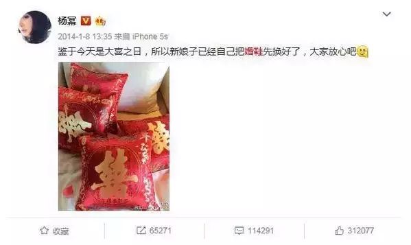 但杨幂偏不,反而非常坦然地接受网友们的调侃,甚至在大婚的日子发微博说:新娘知道自己脚臭,鞋已经换好。