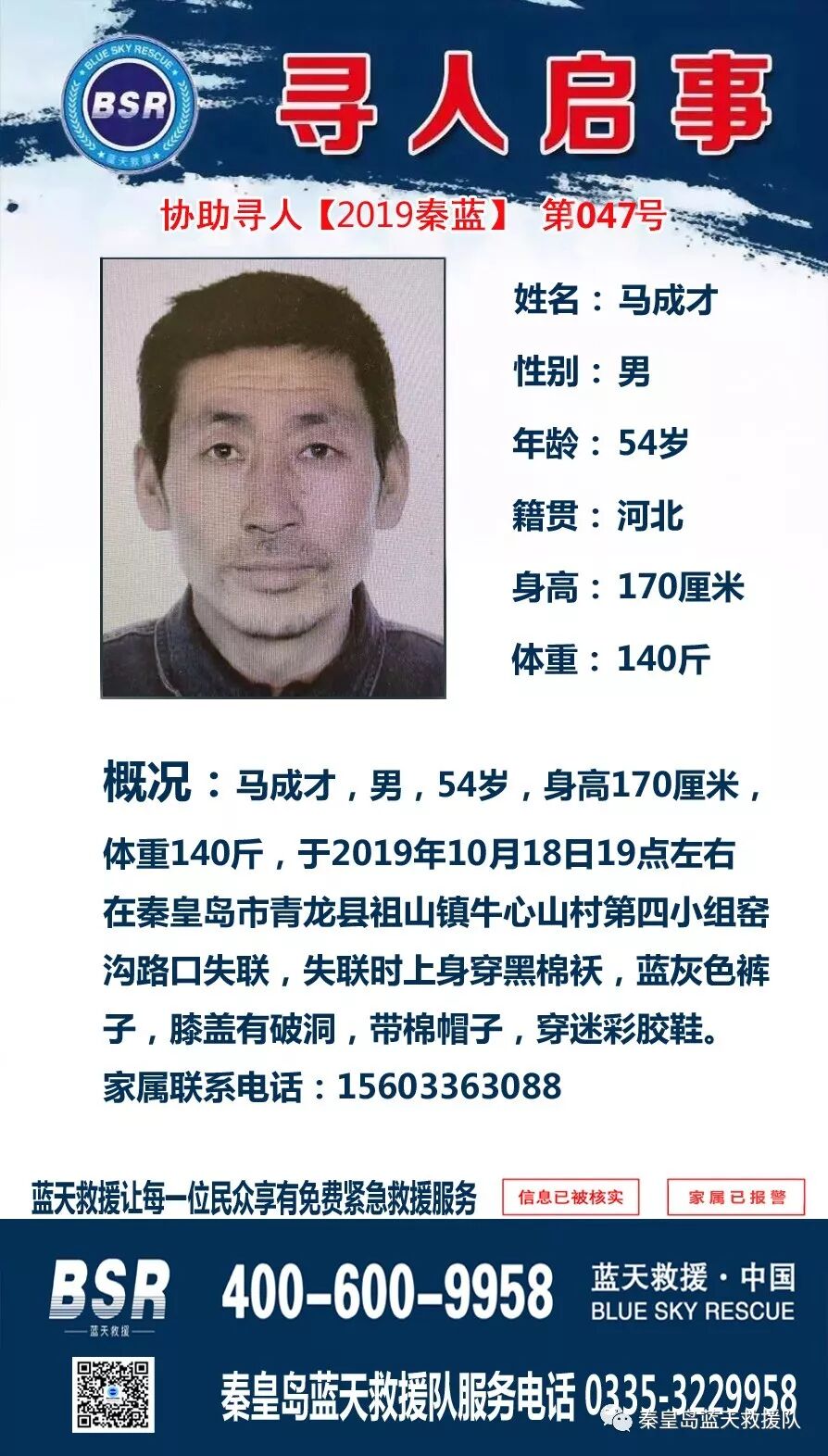 马成才,男,54岁 身高170厘米,体重140斤, 于2019年10月18日19点左右在秦皇岛市青龙县祖山镇牛心山村第四小组窑沟路口 失联, 失联时上身黑棉袄,蓝灰色裤子,膝盖有破洞,带棉帽子,穿迷彩胶鞋。