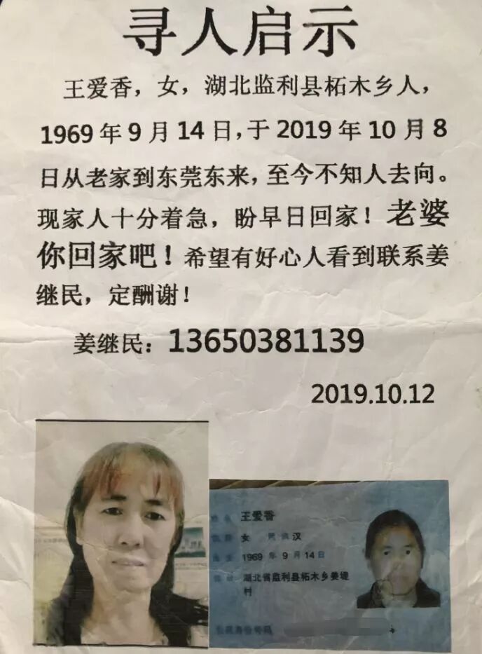 “我叫姜继民,是湖北荆州监利县柘木乡姜堤村人,我的妻子名叫王爱香,1969年9月14日出生,今年五十岁了。我们两个都在广东东莞塘厦镇打工,在家具厂做喷油、打磨工作。”姜先生双眼通红向记者说道。据姜先生回忆,今年9月28日,妻子王爱香从东莞回到湖北家中喝喜酒,与姜先生约定好10月8日从湖南岳阳出发,乘坐火车回东莞,“8号上午我还给她打电话,让她到了岳阳给我发个消息告诉我一声,当天下午五点左右,我再给她打电话,就联系不上她了。”