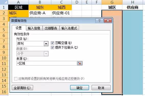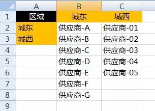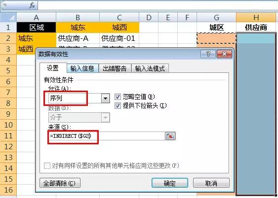 如何做双重有效性?比如城东有10个供应商,城西有10个供应商,我先A列有效性选择城东城西,B列再选供应商,但是只有10个选择(根据A列),而不是20个?