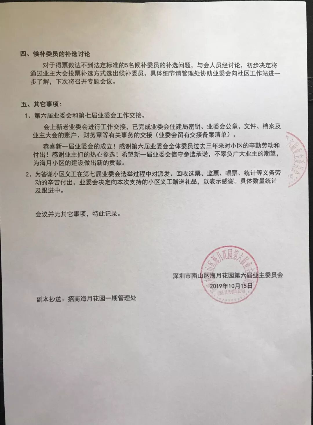 四、候补委员的补选讨论对于得票数达不到法定标准的5名候补委员的补选问题,与会人员经讨论,初步决定将通过业主大会投票补选方式选出候补委员,具体细节请管理处协助业委会向社区工作站进一步了解,下次将召开专题会议。 五、其它事项:1、第六届业委会和第七届业委会工作交接。