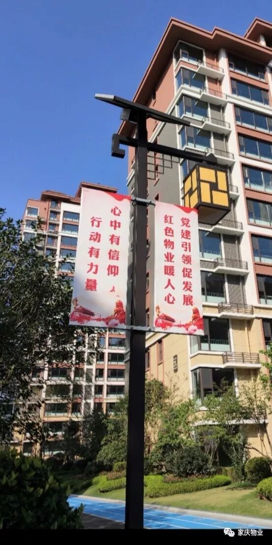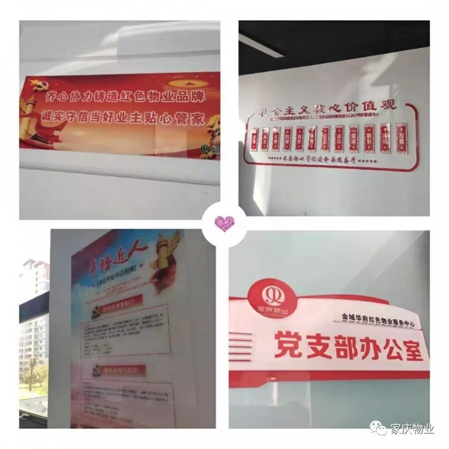 打造党建阵地 营造红色氛围为全面推进红色物业工作开展,家庆物业在金域华府·东府物业活动中心成立了党支部活动场所,并积极开展各类党建活动。公司各项目也因地制宜,利用路灯杆、公告栏、办公区域走廊等位置全面打造“红色物业宣传阵地”,在浓浓的红色氛围中践行党建引领下的高品质物业服务。