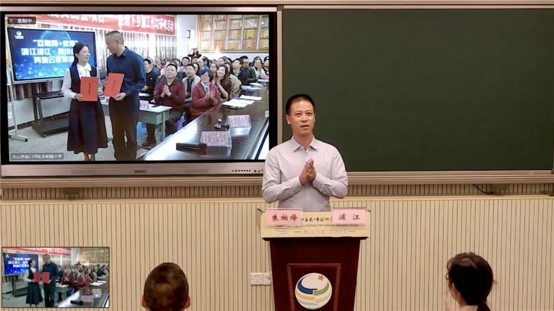 开场仪式上,浦江县龙峰国际学校校长朱柏烽、浦江县教育局普教科负责人陈伟忠和远赴金口河支教的全国优秀教师祝响响互动,还现场连线在杭州的浦江教育局技术中心主任张世营,进行三方对话。
