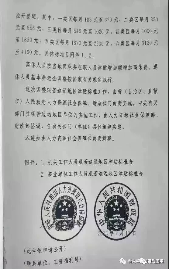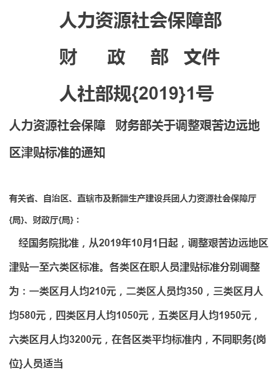 ?国家人社部、财政部在年初联合印发《关于调整艰苦边远地区津贴标准的通知》,从2019年10月1日起,调整艰苦边远地区津贴一至六类区标准,六类区每月最高4160元!目前,一些省已经开始执行!