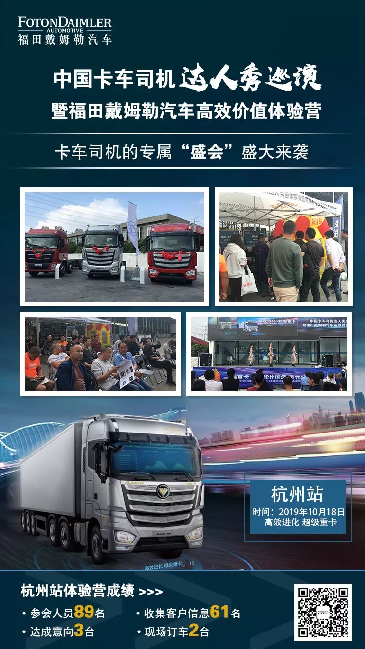 2019年10月18日,“中国卡车司机达人秀巡演暨福田戴姆勒汽车高效价值体验营”来到了遵义和杭州,参会人员174名,收集客户信息111名,达成意向13台,现场成交8台。