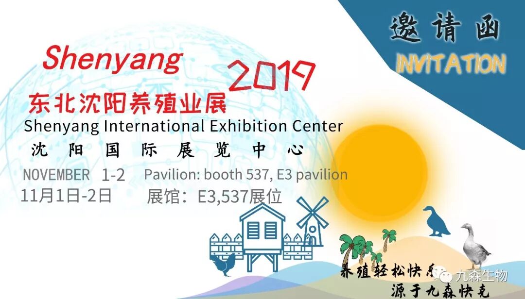 您好!河北九森生物科技有限公司 诚挚邀请您于11月1-2 日赴 Shenyang 2019 东北沈阳养殖业展 现场参观。共聚沈阳国际展览中心。