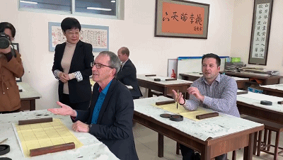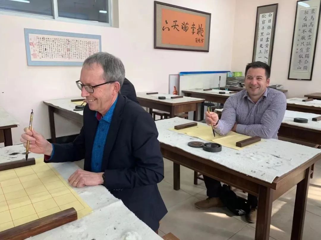在结束校园建设参观后,新西兰校长团一行走进教室,坐在课桌前亲身体验了一次中国书法课。在中方老师的介绍下,新西兰校长们很快掌握了握笔的方法,饶有兴致的在宣纸上挥笔泼墨。