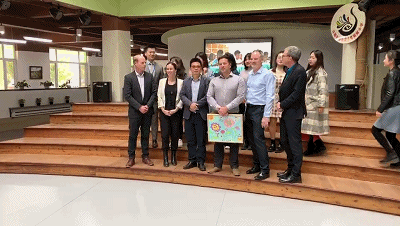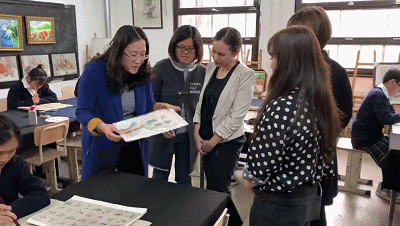 在参观国画教室时,同学们将自己创作的作品作为礼物送给新西兰校长团,作为此次参观交流的纪念。新西兰校长手捧礼物与中方学生合影留念。