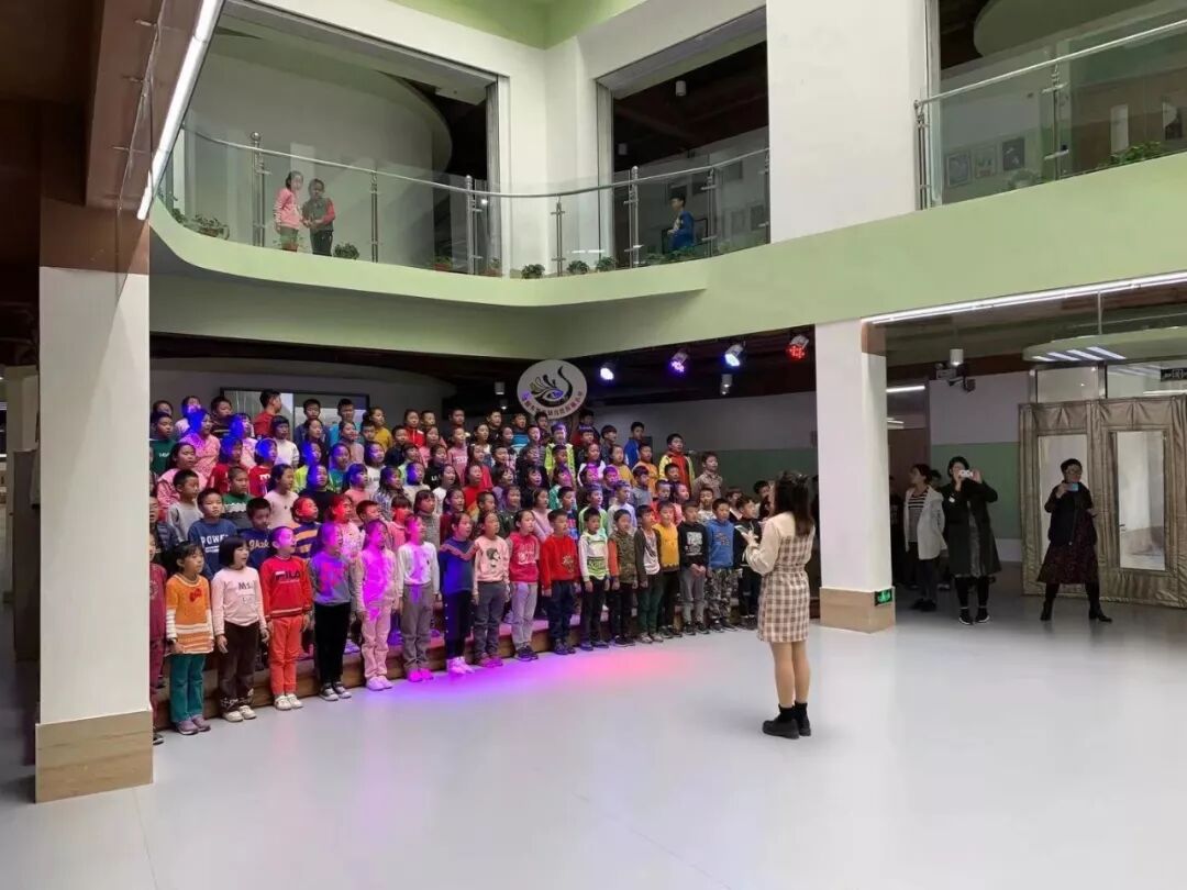 从室外走入室内,参观团一行来到学校楼大厅,在这里由浑南区第九小学学生组成的合唱团早已在此等候校长团的来临,大家纷纷落座,随后同学们用优美的歌声欢迎客人的到来。