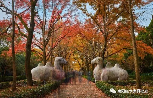 不论什么原因,明孝陵的神道并没有端直而上,而是绕开了孙陵岗蜿蜒而上,形似北斗七星。明孝陵神道也是明孝陵最著名的景观之一,石道两边矗立着狮子、獬豸、骆驼、象、麒麟、马6种石兽,每种两跪两立,夹到迎侍,神兽各有寓意,彰显出大明王朝的恢弘与气派。明孝陵因其高超的建筑与石刻艺术、影响深远的陵墓规制与模式,而被誉为“明清皇家第一陵”。