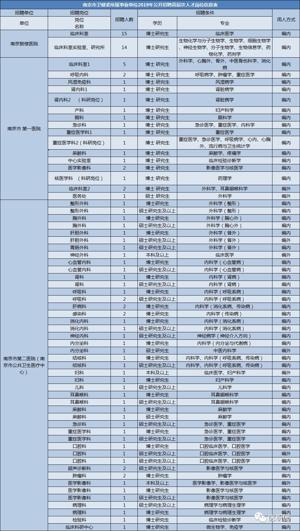 本次招聘相关信息在南京市人力资源和社会保障局网(http://rsj.nanjing.gov.cn)、南京市卫生健康委员会网(http://wjw.nanjing.gov.cn)以及各招聘单位网站上发布,具体的招聘单位、岗位、数量、资格条件等详见《南京市卫健委所属事业单位2019年公开招聘高层次人才岗位信息表》(以下简称《岗位信息表》)。