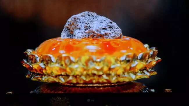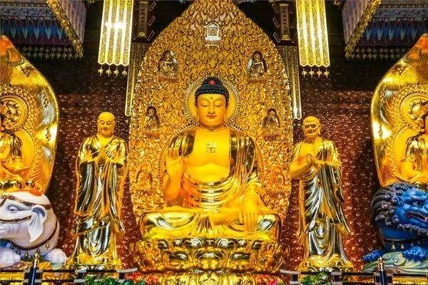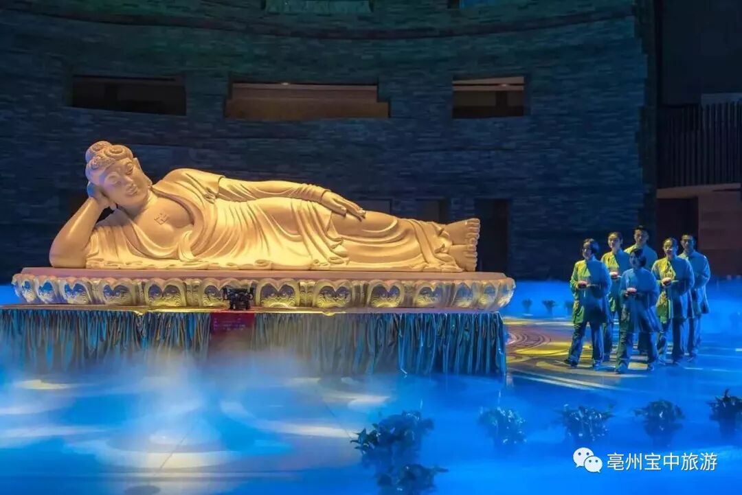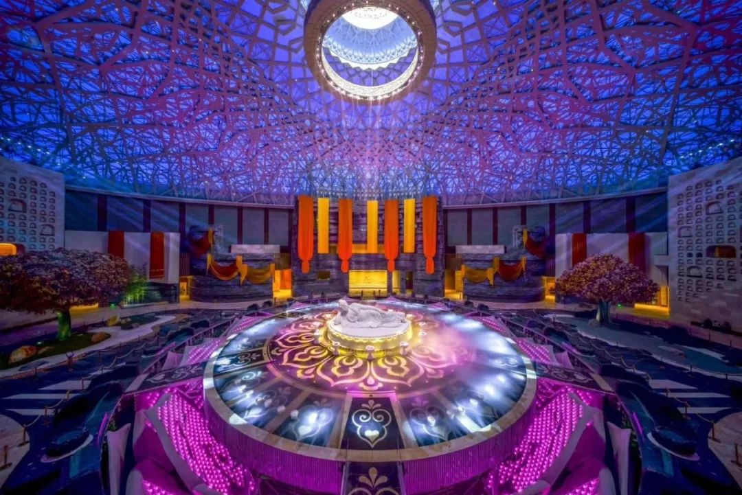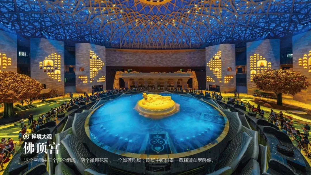 金碧辉煌,头顶一座椭圆形的巨大穹顶上有各色华丽的水滴、祥云、莲花等图案以及数百尊造型栩栩如生的佛像,展现出一派浓郁的佛国氛围。来这里的人基本都会绕围环绕一圈,嘴里念念有词,或双手合十或俯身三拜九叩,以表达心中的信仰.最引人注目的便是中间供奉佛祖顶骨舍利圣塔,塔高21.8米,整体工艺精湛,塔身通体以锡青铜铸胎锻造,表面鎏金,塔塔刹的核心为水晶牟尼宝珠,象征着大日如来的三昧耶。