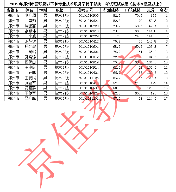 由于目前官方没有给出具体排名,所以京佳老师按不同职级给大家做了一个考试成绩的排名,供大家参考,具体排名如下: