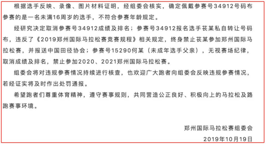 替跑参加郑州马拉松,组委会处罚来了。