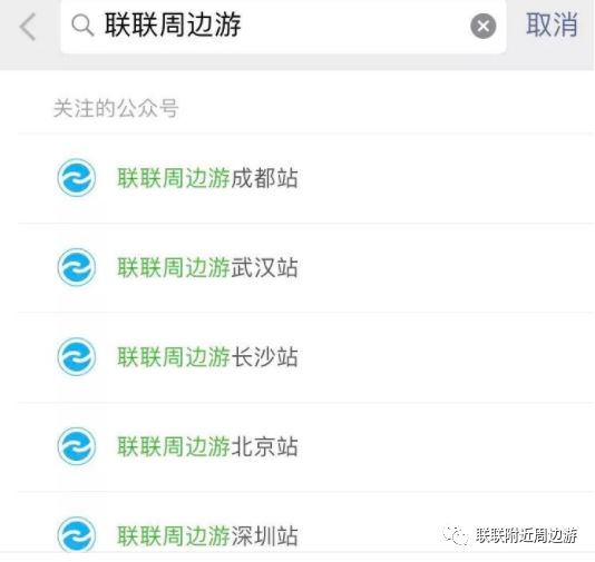 只需要关注:联联周边游任意城市就可以全国通用了。(进入公众号之后可以自由切换城市)