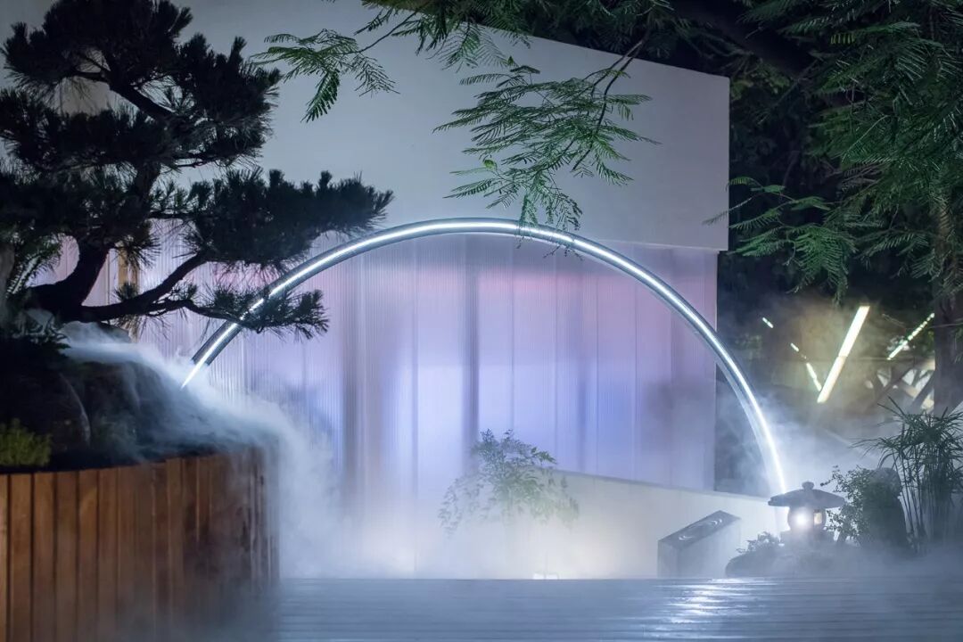 庭院概念由符印和枯山水相结合,以庭院作符阵,庭院布局以巨大的水滴涟漪展开,顺势而上,花草景象,随四时变换。闯入阴阳师的静谧庭院,妖约此间,百鬼夜行。