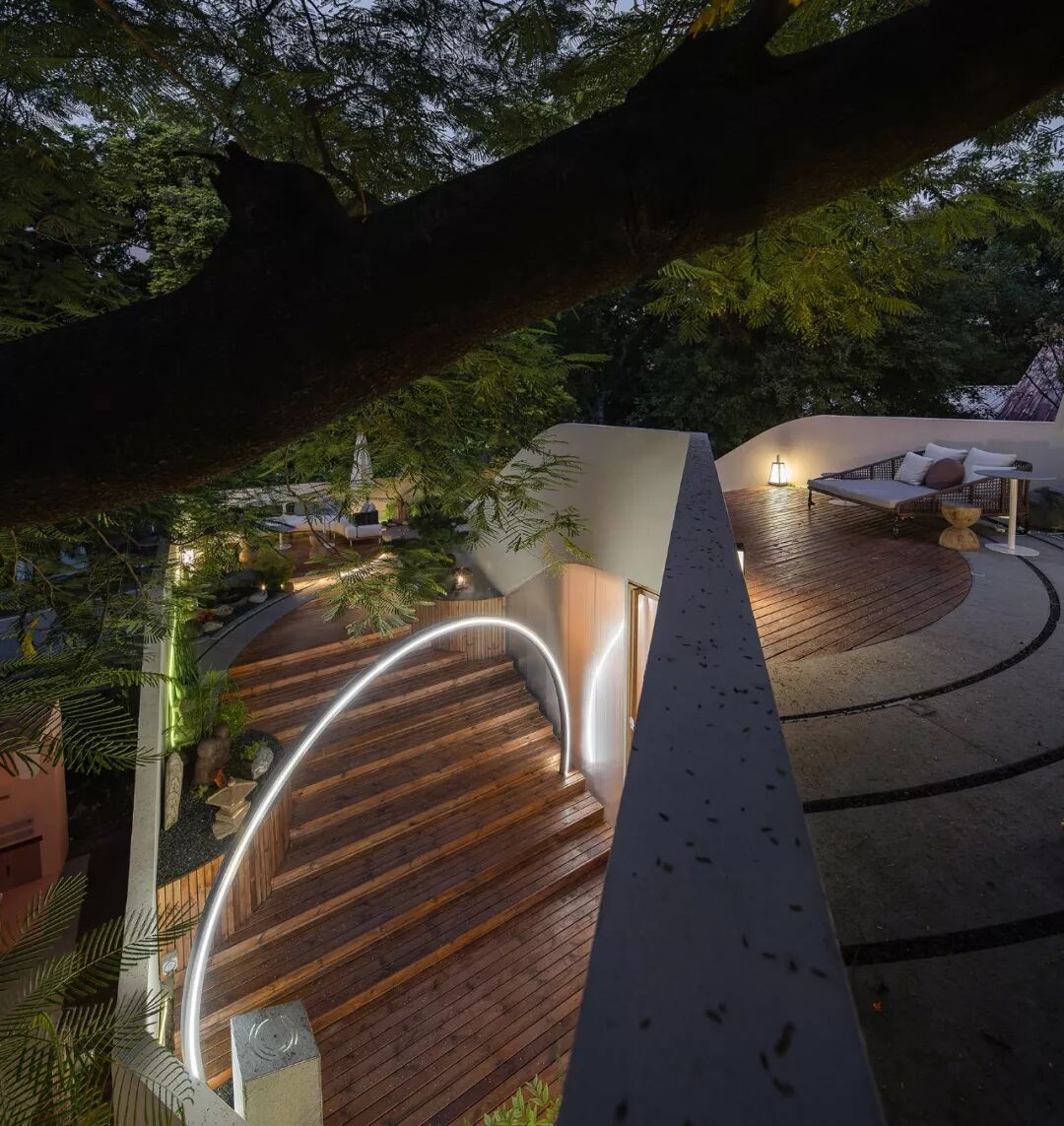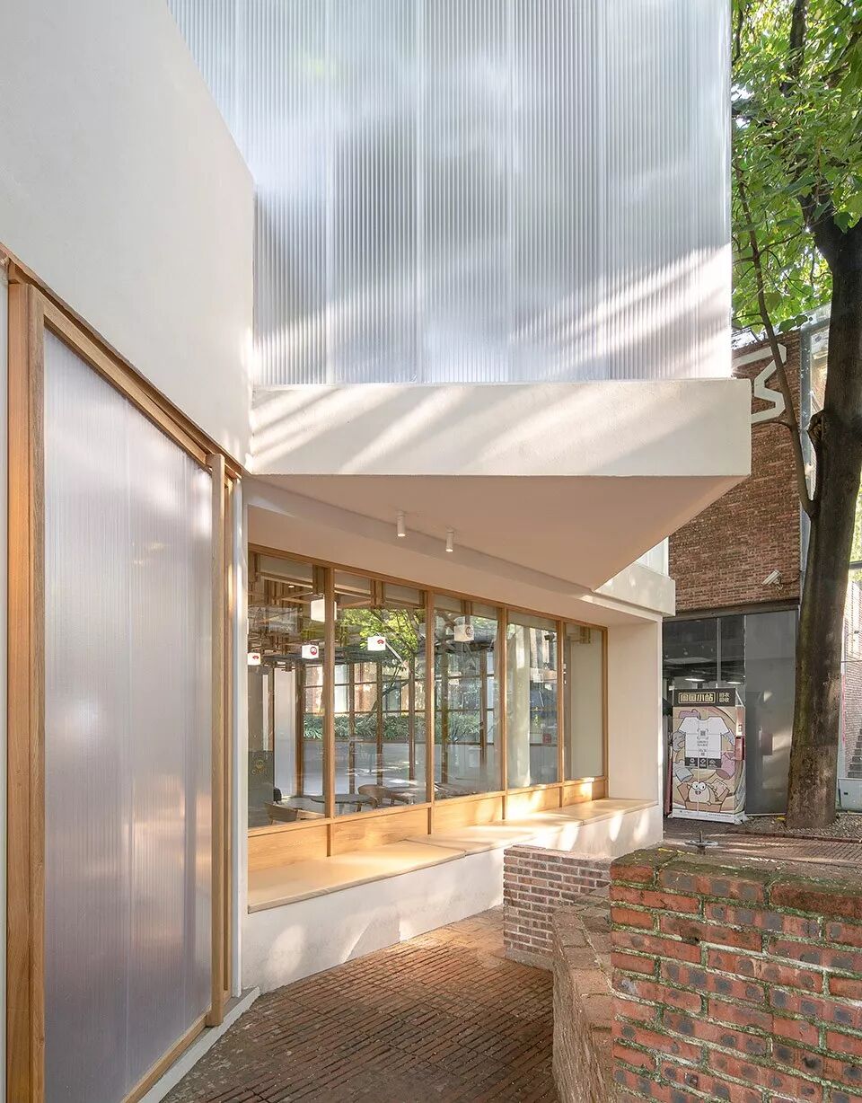 Coffee/Bar位于建筑的一层,白天,周围树木的阴影投射到半透明的聚碳酸酯板上,将光与自然诗意带入室内空间,空间中置入硬朗的麻石体块作为吧台,木结构在自然光线的照耀下显得分外的柔和。主题店白天为咖啡店,晚上通过改变灯光氛围切换为酒吧模式。