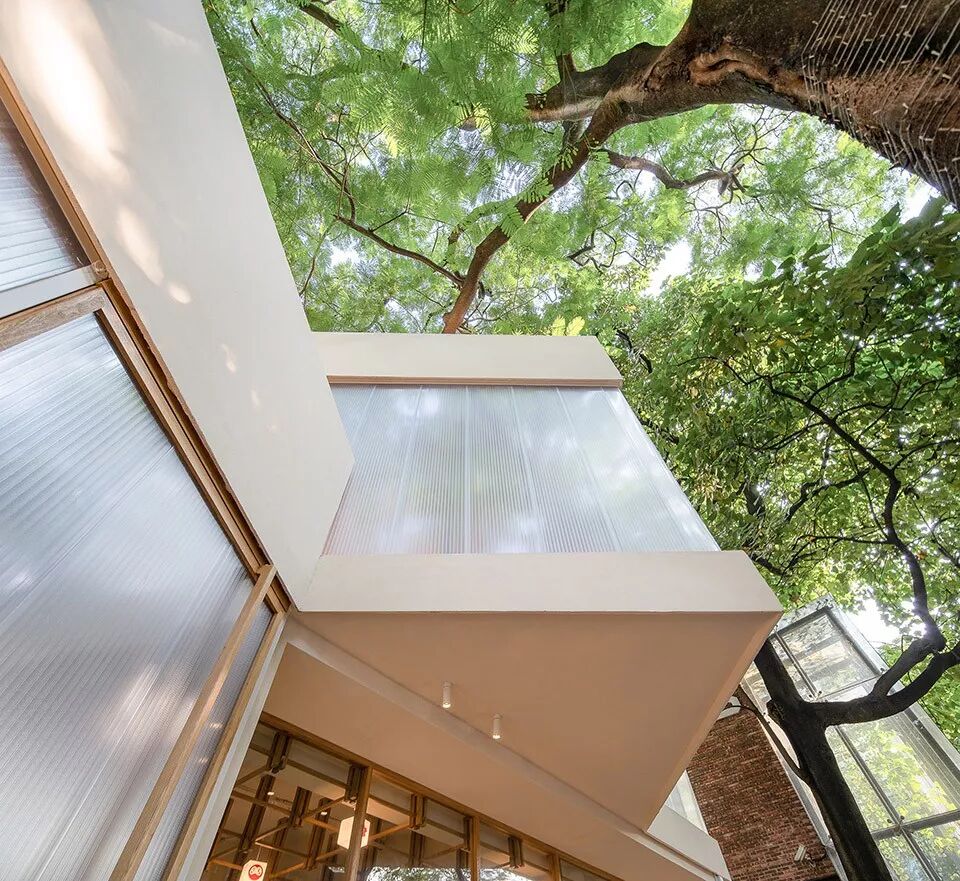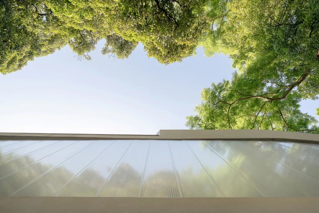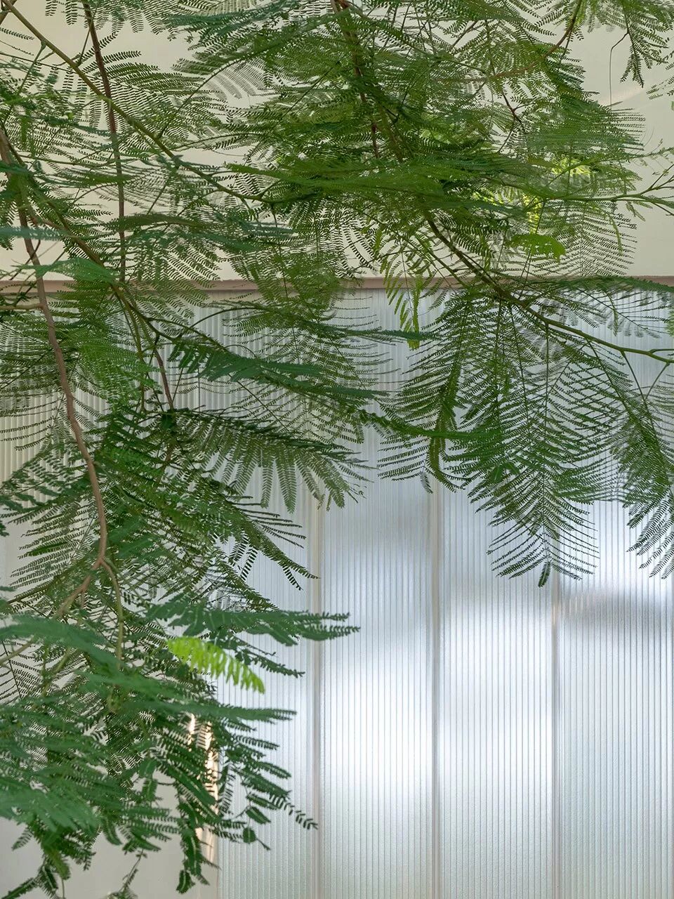 为了建造轻盈的建筑,采用了木质结构系统结合半透明的聚碳酸酯板,使其快速的建造。木结构支撑建筑物的皮肤,并在立面之间形成间隙,此距离增强其节奏感。