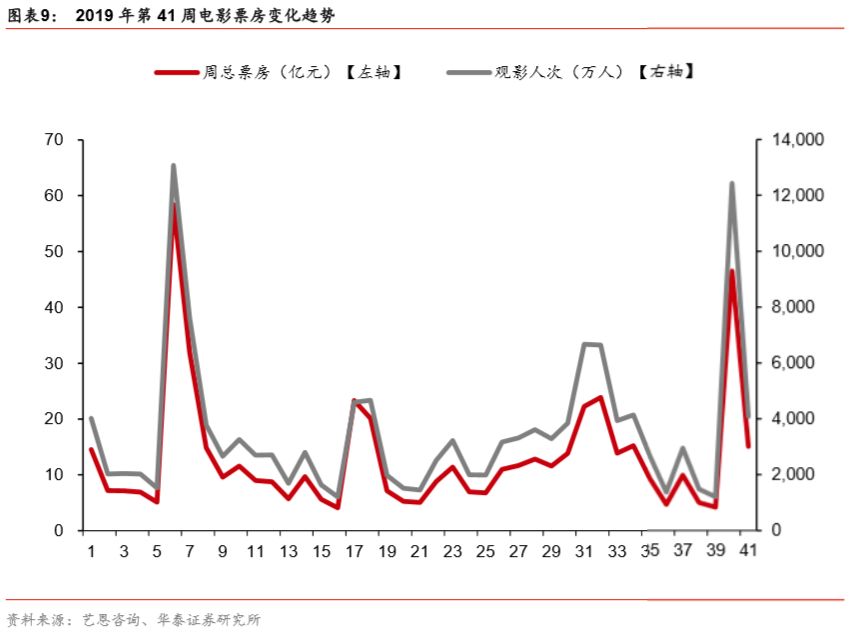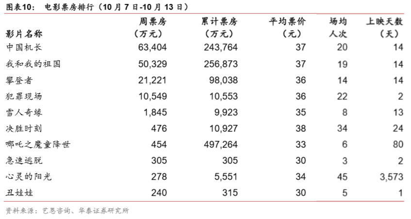 院线票房表现(10月7日-10月13日):万达院线单周票房2.10亿元,环比下降63.35%,市占率15.0%,排名第一;广东大地单周票房1.42亿元,环比下降68.41%,市占率10.1%,位居第二。