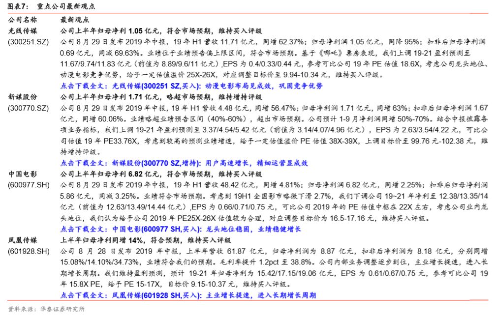6、出版方面,板块中报总体表现稳健,在校学生数有望增长、纸价下行对成本端压力的缓解、可观的股息收益率有望吸引保险等长期资金;关注凤凰传媒、中南传媒、中信出版。