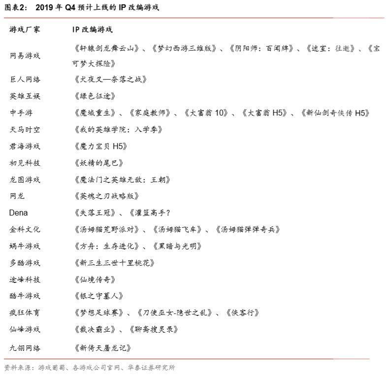 根据游戏葡萄的统计,预计Q4上线的133款游戏中,73款为代理游戏。代理游戏与自研游戏占比相距不大;根据伽马数据,2019年上半年游戏中,IP改编游戏占比超65%,近几年IP改编游戏收入占整个游戏市场收入的六成以上。预计Q4上线游戏中有33款为IP改编而成,其中不乏知名IP,如网易游戏的《轩辕剑龙舞云山》、《阴阳师:百闻牌》,中手游的《新仙剑奇侠传H5》、蜗牛游戏的《方舟:生存进化》、Dena的《灌篮高手》等。我们认为热门IP改编的游戏能在上线之前带动热度、放大曝光,从而有望提升流水,但同时也存在玩家期待值更高,容易收到负面评价的风险。
