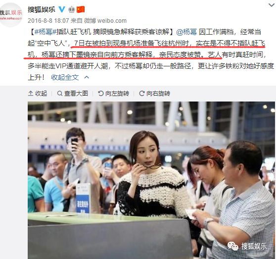 有一次,杨幂为了能赶上飞机,不得不选择插队,当时她一一和前面的人解释,获得大家体谅后她终于登机成功。