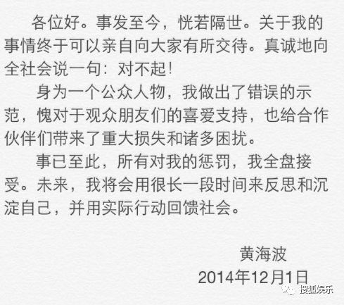 2014年年底,黄海波说自己会用很长一段时间来反思和沉淀自己,并用实际行动回馈社会。