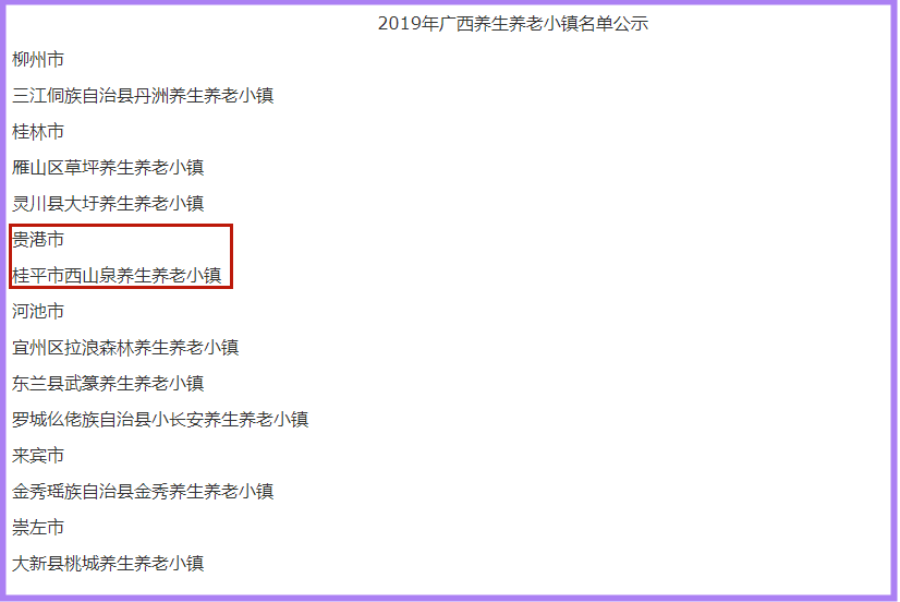 根据自治区政府《广西养生养老小镇创建工作实施方案》(桂政办电〔2016〕197 号)精神,自治区养老服务业综合改革试验区建设部门工作联席会议办公室(以下简称自治区联席办)从2019年8月起组织开展广西养生养老小镇评审工作,按照组建评审专家组、现场考评、集中评审、书面征求意见等工作环节,初步评选出2019年广西养生养老小镇名单,现予以公示。