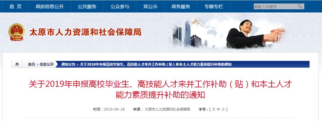 1.申请材料(一)登录太原市人力资源和社会保障局官网(http://rsj.taiyuan.gov.cn),点击“人才补助(贴)申报”栏(或用手机扫描“太原市人才补贴申报系统”二维码),进入“太原市人才补贴申报系统”,录入个人信息,上传印证资料,完成提交后,自动生成并打印《高校毕业生来并工作生活补助申请表》、《高校毕业生(高技能人才)来并工作租房补贴申请表》、《高校毕业生来并工作学费补贴申请表》、《太原市本土人才能力素质(学历学位)提升补助申请表》、《太原市本土人才能力素质(职业技能)提升补助申请表》;(原件)(二)用人单位填写《高校毕业生来并工作生活补助花名表》(附件1)、《高校毕业生(高技能人才)来并工作租房补贴花名表》(附件2)、《高校毕业生来并工作学费补贴花名表》(附件3)、《太原市本土人才能力素质(学历学位)提升补助花名表》(附件4)、《太原市本土人才能力素质(职业技能)提升补助花名表》(附件5);(原件、电子版excel)(三)身份证、户口簿本人单页和本人人才联名卡;(原件、复印件2份)(四)毕业证、学位证和《教育部学历认证书电子注册备案表》(留学回国人员需提供教育部留学服务中心出具的《国(境)外学历学位认证书》);高技能人才需提供相关职业资格证书;(原件、复印件)(五)行政单位录用文件、企业劳动合同或事业单位聘用合同,劳务派遣人员另需提供实际用工单位与劳务派遣公司签订的有效期内劳务派遣协议(申请生活补助、租房补贴、学费补贴人员提供);(原件、复印件)(六)在提升学历学位期间(入学至毕业后)或取得职业技能证书以来与用人单位签订的劳动(聘用)合同(公务员不需提供),劳务派遣人员另需提供实际用工单位与劳务派遣公司签订的有效期内劳务派遣协议(申请能力素质提升补助人员提供);(原件、复印件)(七)所在单位营业执照或法人登记证书;(原件、复印件)(八)参加企业或机关事业单位基本养老保险证明材料;(原件)(九)用人单位出具的申请人岗位证明材料(中央、省属驻并事业单位人员提供)。(原件)特别注意:1.《高校毕业生来并工作生活补助申请表》、《高校毕业生(高技能人才)来并工作租房补贴申请表》、《高校毕业生来并工作学费补贴申请表》、《太原市本土人才能力素质(学历学位)提升补助申请表》、《太原市本土人才能力素质(职业技能)提升补助申请表》必须通过“太原市人才补贴申报系统”自动生成并打印,自行制作的表格不予受理;2.《教育部学历认证书电子注册备案表》毕业生可在中国高等教育学生信息网(学信网)免费认证获取;3.参加企业基本养老保险证明可以在太原市人力资源和社会保障局官网(http://rsj.taiyuan.gov.cn)下“太原人社网上办事大厅”打印或在各级社保窗口办理,机关事业单位基本养老保险证明在各级社保窗口自行办理;4.2019年度生活补助、租房补贴发放至2019年9月(含);5.申请材料复印件均需加盖单位公章。2、办理流程(一)申报时间:2019年9月27日—11月15日。(二)材料提交。申请人向所在用人单位提出申请(劳务派遣人员向实际用人单位申请),用人单位对材料真实性核实并在本单位公示5个工作日后,向所在地县(市、区)、开发区(园区)政务大厅人才服务窗口申报,其中中央、省属驻并事业单位,市属行政、事业单位向市政务服务中心人才服务窗口申报。(三)审核。各受理地人社局或人力资源部门负责审核,审核不通过的应告知申请人。(四)公示。11月中旬,各审核部门在本地政府官网对其审定名单进行公示,其中市人社局在其官网进行公示,公示时间为5个工作日。(五)发放。由市人社局和各县(市、区)、开发区(园区)将人才补助(贴)发放至申请人人才联名卡。(六)申诉。申请人对审核结果有异议的可以向市人社局申诉。3、法律声明申请人必须如实填报个人信息,对提供虚假材料或采取其他弄虚作假行为骗取财政补助(贴)资金的单位或个人,一经发现取消补助(贴)资格,纳入单位和个人信用记录,并保留追究其法律责任的权利。政策咨询电话: 0351-4030390/0351-4030019