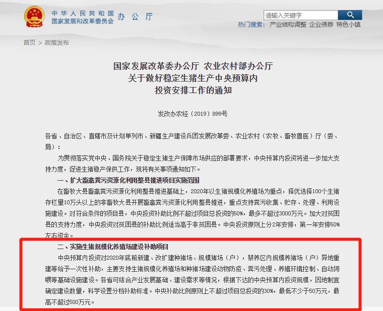补贴标准:1.建养猪场最高补助500万。中央预算内投资对2020年底前新建、改扩建种猪场、规模猪场(户),禁养区内规模养猪场(户)异地重建等给予一次性补助。中央补助比例原则上不超过项目总投资的30%,最低不少于50万元,最高不超过500万元。