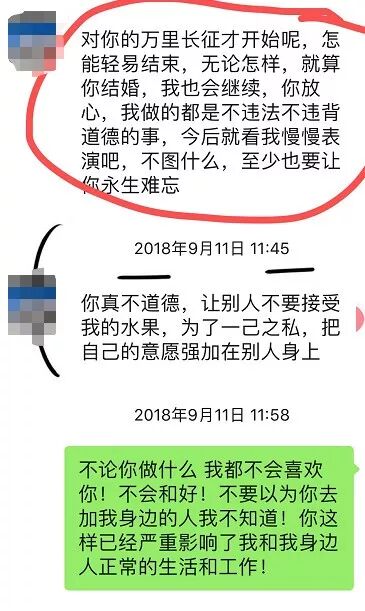 然而,没过多久,男方就开始不断出现在女方的家和公司附近,并且采取各种手法骚扰,先是要求和好,和好不成,就言语威胁。