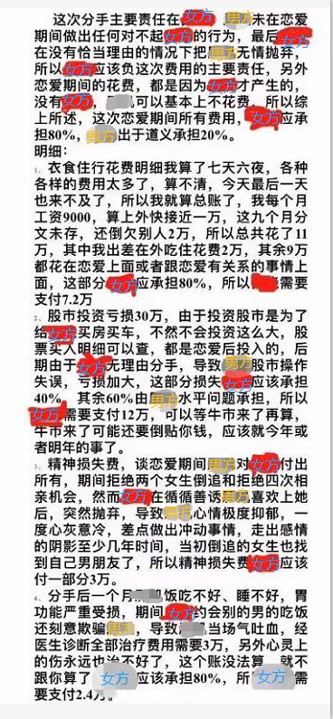 不过,紧接着,男方又列出了详细的分手费用明细,里面除了恋爱期间衣食住行的各项花销,还罗列了因为恋爱导致的投资亏损、精神损失费、心理创伤费、汽车折旧费等等费用,共计25万,要求“女方偿还。