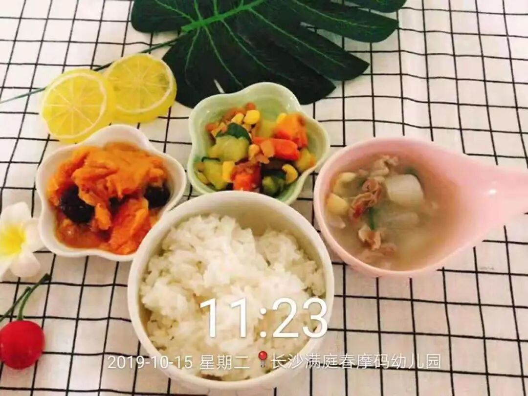午餐:白米饭/虾仁滑蛋/木耳淮山炒肉/小炒红薯叶/田园牛骨汤