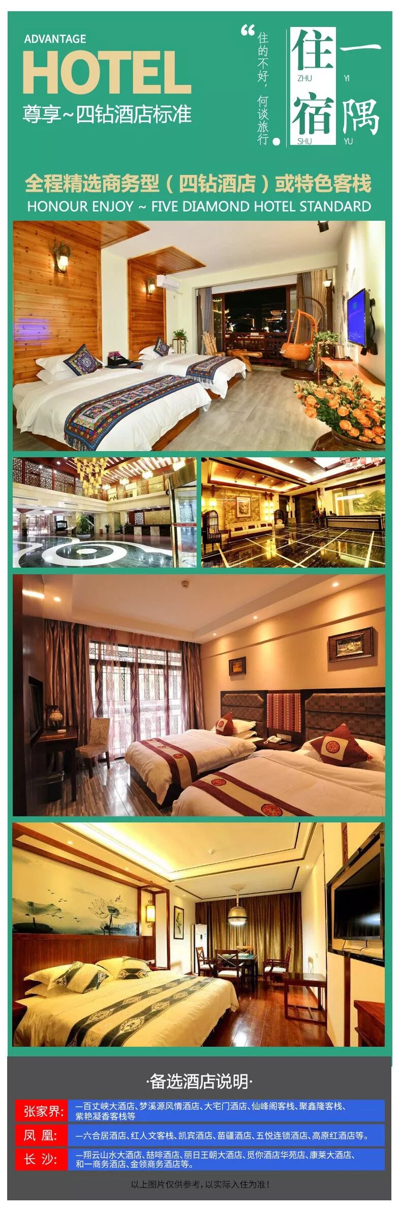 接待标准RECEPTION STANDARD1、【住宿】:商务型(四钻)酒店双标间。备注:五日单房差:330元,若不占床退250元.六日单房差:420元,若不占床退320元。不提供自然单间,如无法拼房,提前或当地补足单房差。(湘西地区用电及用水较为紧张,景区用水限时供应,请客人在晚上22:00前洗浴;因景区电力紧张,酒店会出现偶然停电或深夜空调掉闸的个别现象,此状况属于人力无法抗拒因素造成,请客人予以理解和包容。湖南为了响应国家节能环保的号召,酒店不提供一次性用品,请客人自备。)