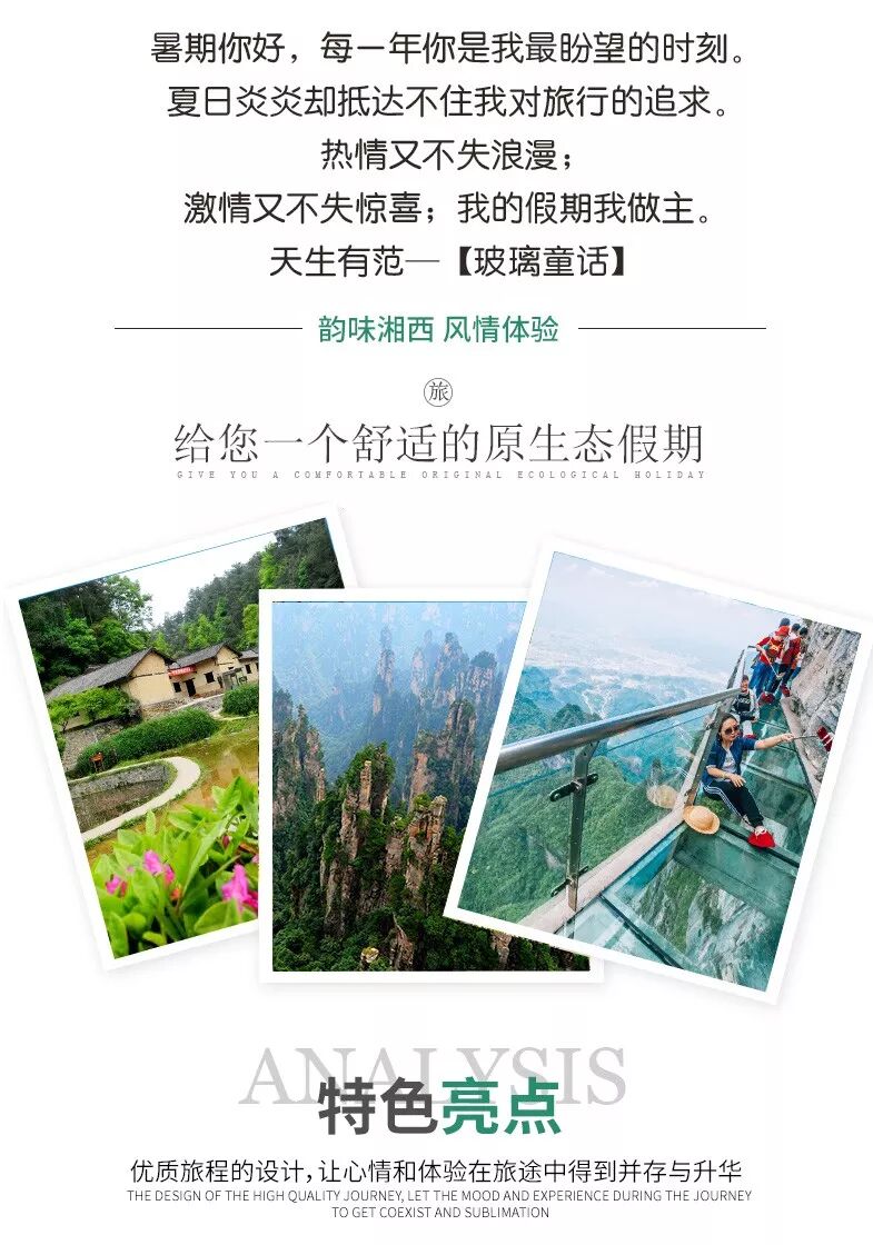 早餐后乘车前往【张家界世界第一玻璃桥】(赠送玻璃桥上桥门票,特别备注:玻璃桥需提前五天提交游客名单及预付全额票款,一经预定,不得退票,如旺季期间玻璃桥景点因道路堵车、雷雨天气、景区关闭、无法预约订票等种种原因无法正常参观,改为同等级景点宝峰湖,费用不变,特别备注:本行程因时间关系,我社优先安排单玻璃桥景区(以下简称C线票)游览,如景区C线票紧张,预约不到C线票情况下,则安排B线票游览,客人需自理35元/人寻宝电梯费用,增加【大峡谷景区】游览),参观、体验“万金一字征名”和号称“世界最高最长”的【世界第一玻璃桥】桥高约400多米,长约370米,宽6米,全部采用99块透明玻璃铺设而成,感受刺激,陶醉神奇,见证奇迹。后乘车赴张家界第一个国家森林公园【武陵源核心景区】,参观【袁家界景区】(赠送百龙电梯往返费用144元/人,尊享VIP贵宾通道、无优无退):探寻《阿凡达》电影中的群山漂浮、星罗棋布的玄幻莫测世界--“哈利路亚山”即“南天一柱”(又名乾坤柱),参观云雾飘绕、峰峦叠嶂,继往气势磅礴的迷魂台、天下第一桥等空中绝景;后游览走进张家界北纬30°地理新发现【杨家界景区】:看峰墙之绝,峰丛之秀,峰林之奇等。漫步世界最美的【金鞭溪风景区精华段】:杉林幽静,穿行在峰峦幽谷云间,溪水明净,人沿清溪行,胜似画中游,这是一条观赏性与自娱性结合的旅游线路,十里长溪,山回路转,一步一景,十步一重天,小溪潺潺的流经你的脚下,似琵琶,似古筝,时而丁冬悦耳,时而涓涓小吟。晚餐后观看【张家界?魅力湘西晚会】(赠送价值228元/人的门票,不看不退,若需升级VIP座位请自补差价):《张家界?魅力湘西》创办于2000年,由黄永玉老先生题名;现由冯小刚出任晚会总导演;宋祖英、张也、陈思思三位湘籍歌唱家演唱主题歌。曾代表文化部赴欧洲参加了2014和2015“欢乐春节”演出,原创节目《追爱》荣登2012央视龙年春晚,通过精湛的艺术表现,向全世界观众展示了大湘西璀璨的民族文化,入住酒店!
