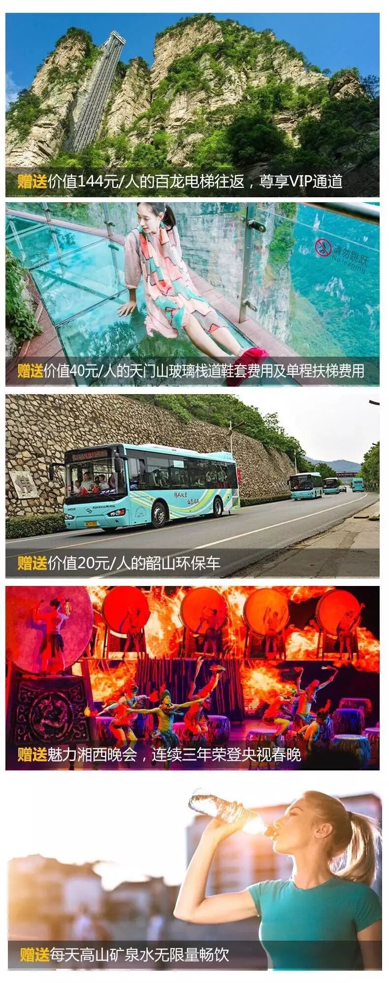 ,赠送价值144元/人的百龙电梯往返,尊享VIP通道, 赠送价值40元/人的天门山玻璃栈道鞋套费用及单程小扶梯费用,赠送价值228元/人的魅力湘西晚会,赠送每天高山矿泉水无限量畅饮;