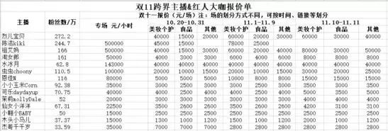 在跨界主播&红人大咖报价单,双11专场费最高可达500000元/小时(陈洁kiki和祖艾妈)。在10月20日至10月31日预售期内,美妆个护类直播最高可达45000元/场,食品类最高可达40000元/场;在11月1日至11月9日预热期内,美妆个护最高可达78000元/场,食品类最高可达40000元/场;在11月10日至11月11日狂欢节期间,各品类直播价格均有不同幅度的上涨,美妆个护类最高可达80000元/场,食品类最高可达40000元/场,其他类最高可达50000元/场。