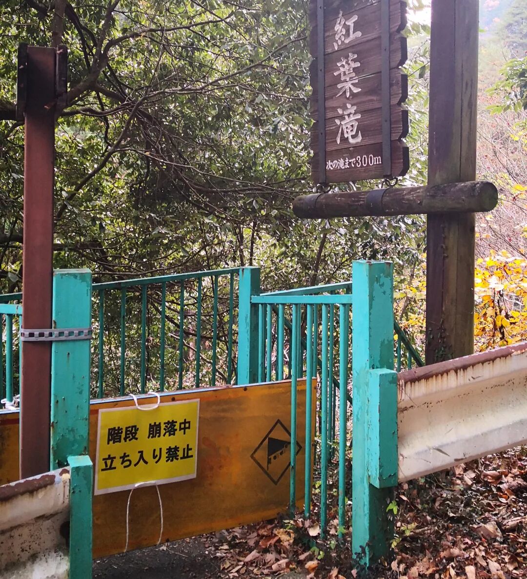 计划中的当地比较有名的红叶瀑布。我们到达的时候才发现因为山体滑坡,景点已经关闭了。不甘心的我们,在旁边的小瀑布留下了几张照片,打道回府。