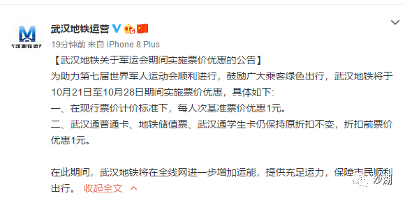 【武汉地铁关于军运会期间实施票价优惠的公告】