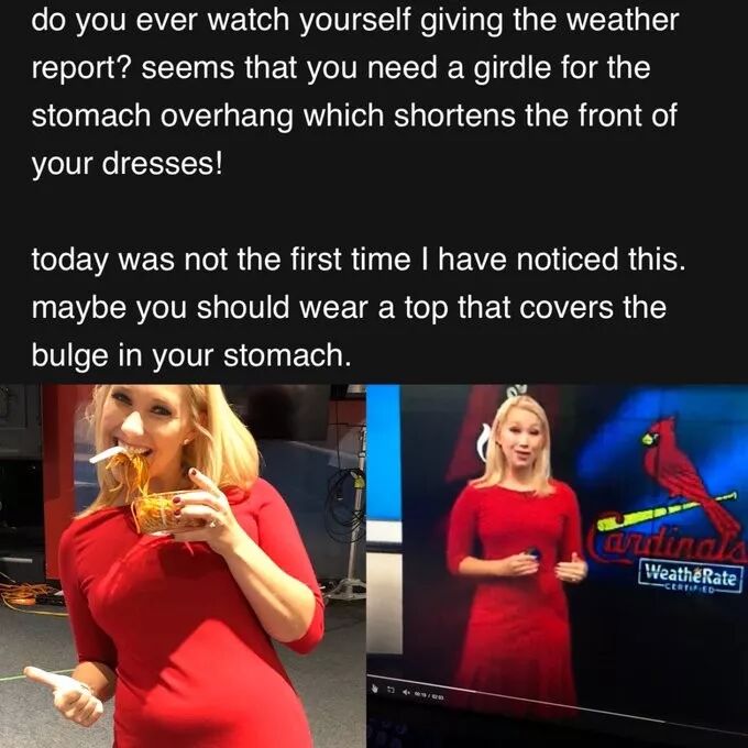 “Do you ever watch yourself giving the weather report?” Mary wrote. “Seems that you need a girdle for the stomach overhang which shortens the front of your dress. Today was not the the first time I have noticed. Maybe you should wear a top that covers the bulge in your stomach.”